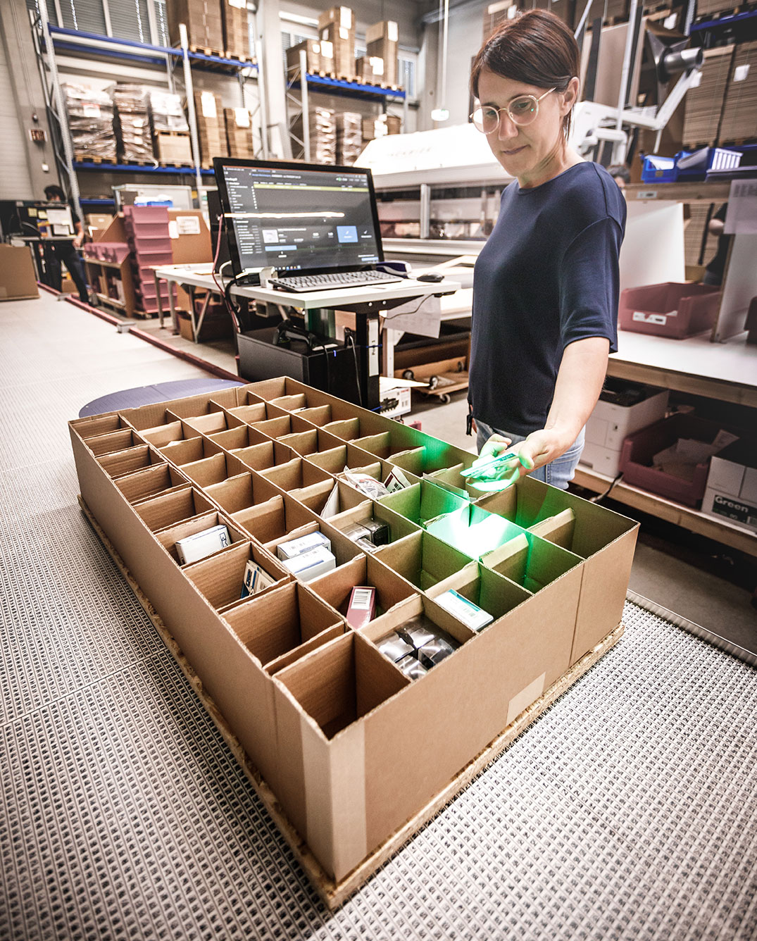 Six high-speed lifts connect a total of 12 levels of the automatic small parts store allowing the robots to switch between levels quickly. The almost 8,000 goods carriers in different sizes are taken to the in-feed and out-feed stations by robots on continuously optimised routes. The new warehouse of the company Härtle will include four of these stations. With a daily operating time of 11 hours this results in up to 8,000 goods carrier presentations per day. The goods carriers are equippped with goods frequently ordered in combination already during in-feeding in order to drastically increase the efficiency of the individual picks. Furthermore, all workplaces are equipped with pick-by-light systems to always illuminate the proper position during in-feeding and out-feeding processes in order to relieve the employees.